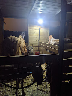 The barn is a 36x25. It has 2 12x12 stalls, 1 12x10 stall, a 5x12 'hall way/ storage area" and a 12x10 tack and feed room. We currently do not have power or water yet, so we use extension cords and hoses.